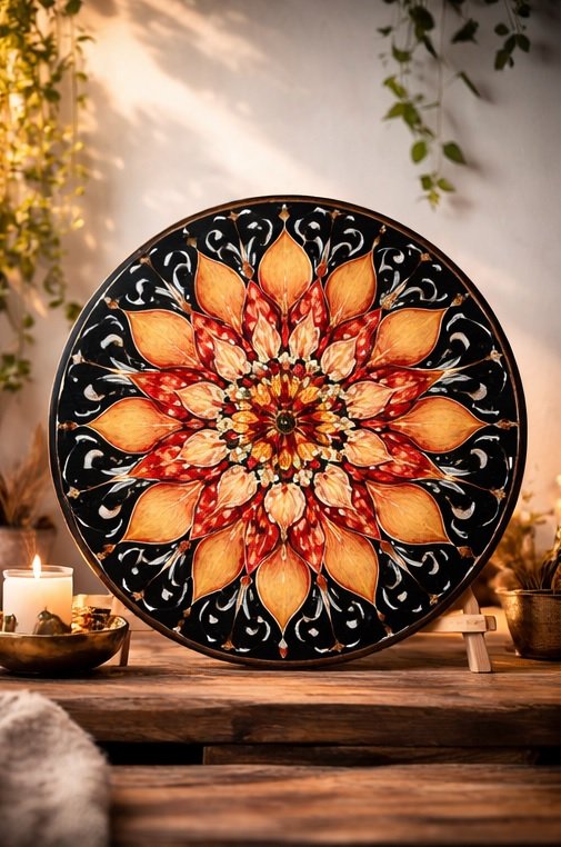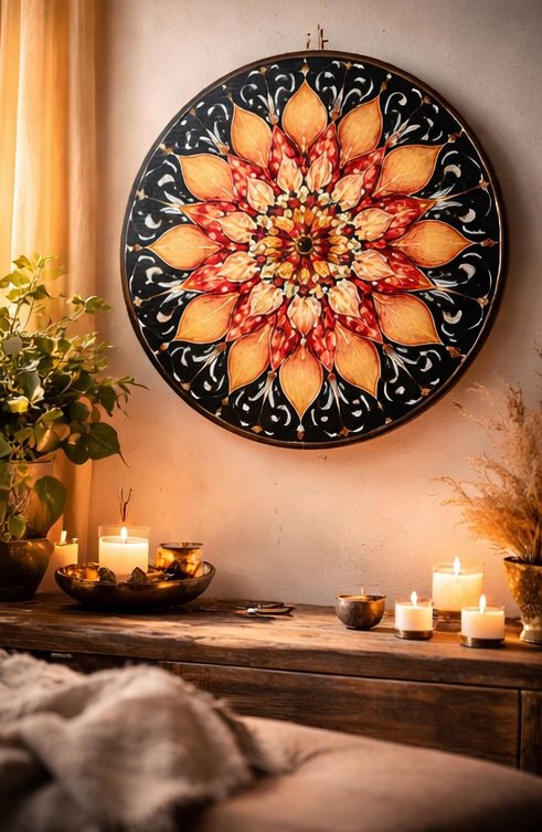 The black background enhances the radiance of the fire tones, creating a dramatic contrast that makes the mandala glow in any interior. Each element is carefully arranged in harmonious symmetry, allowing the eye to rest while the energy expands outward.
