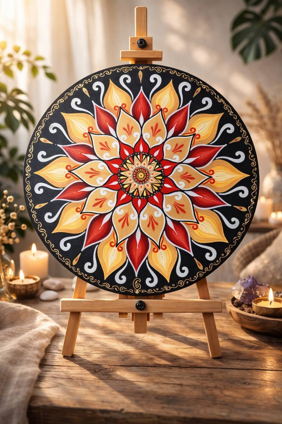 Sacred Fire Blossom is a radiant hand-painted mandala symbolizing inner strength, warmth, and divine feminine energy. A bold fusion of golden light and deep red flame, designed to awaken the heart and bring powerful harmony into any space.